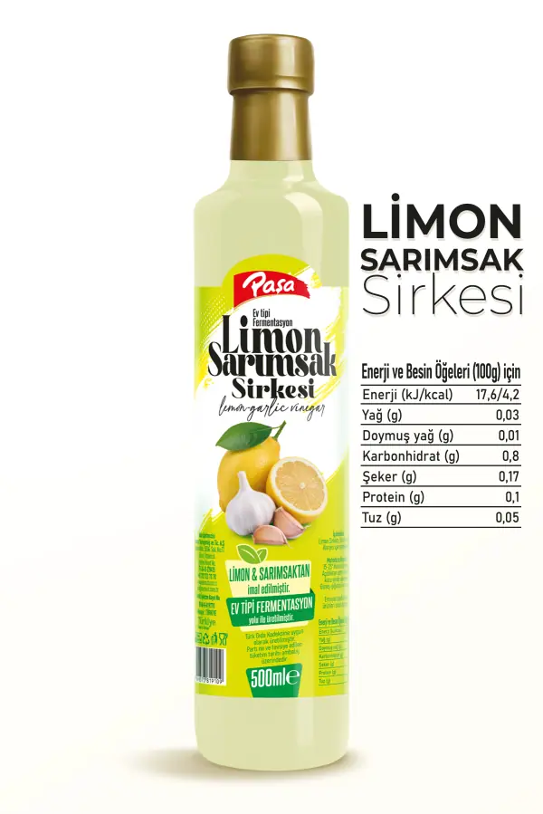 Paşa limon sarımsak Sirkesi, limon ve sarımsak bileşenlerinin ev tipi fermentasyon yöntemiyle üretilmiştir. Katkı ve koruyucu içermez, yoğun kıvamlı ve aromatik bir sirke deneyimi sunar.